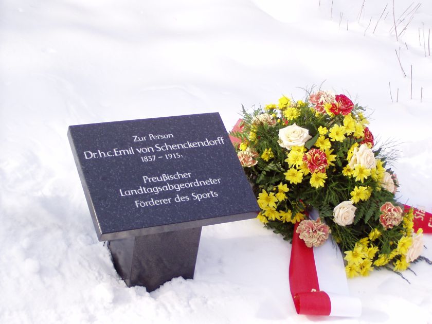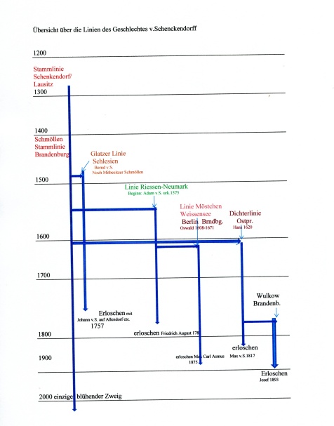 Die Familie vergrößerte sich ab Mitte des 16.Jahrhunderts stark und erfuhr im 17. und 18. Jahrhundert die größte Ausdehnung mit Zweigen bis nach Ostpreußen und Schlesien, vor allem aber im brandenburgischen Kernland. Die schlesische Linie, die bei Glatz reich begütert war (siehe Ahnentafel "Glatzer Linie") diente lange dem Österreichischen Herrscherhaus und wurde dort auch in den Freiherrenstand erhoben. Letztlich dienten aber alle Linien (die schlesische seit den schlesischen Kriegen) zumindest seit der Belehnung mit Schmöllen dem Preußischen Herrscherhaus. Schon das 18.Jahrhundert (gegen Ende) und das 19. Jahrhundert reduzierten die Anzahl der Linien auf unsere älteste Stammlinie aus dem Hause Schmöllen. Alle anderen, teilweise sehr begüterten, Zweige starben im Mannesstamme aus. Zuletzt die Linie auf Gut Wulkow bei Neu-Ruppin. Der letzte männliche Stammhalter verstarb auf einer Reise in die Schweiz 1894 ohne Nachkommen zu hinterlassen. Die Ostpreußische Linie des Dichters starb mit ihm im Mannesstamme Anfang des 19.Jahrhunderts aus. Die sog.Glatzer Linie war bereits im 18.jahrhundert im Mannesstamm erloschen. 1817 kam dann für die Stammlinie unsere Familie und damit für den ältesten Teil der Familie die bittere Stunde, als nicht zuletzt duch die Verwüstungen der napoleonischen Kriege, der alte Stammsitz unseres Geschlechtes, Schmöllen in Ostbrandenburg, endgültig aus der Familie kam. Wie als ob der Besitz nach der jahrhundertelangen Kontinuität nicht zur Ruhe kam, wird erzählt, dass niemals mehr ab diesem Zeitpunkt ein Erbgang des Schloßgutes im Mannesstamm stattfand. Das verhinderten Unfälle und sogar ein Selbstmord im Schloss. Die letzte Besitzerin, Frau v. Einem, deren Vater das Gut erworben hatte, besaß das Schloßgut nur wenige Wochen, bis die Rote Armee den Ort 1945 einnahm und 128 Jahre nach dem Weggang unserer Familie alles, auch das Schloß, zerstörten und die angestammte Bevölkerung vertrieb. Auch die letzte, rechtmäßige, Besitzerin mußte fliehen. Schmöllen in seiner angestammten, historischen Form war damit vernichtet. Es muss davon ausgegangen werden, dass der Verlust des Stammsitzes für die Familie eine tiefgreifende Veränderung bedeutete. Nicht zuletzt bedeutete dies aber auch einen tiefen Einschnitt in das Selbstverständnis eines uralten, landbesitzenden Adelsgeschlechtes. Es ist allerdings bezeichnend für den Selbstbehauptungswillen der Familie, dass man durch angesehene Tätigkeiten in hervorgehobenen Stellungen, einer alten Tradition folgend vorwiegend beim Militär, seine gesellschaftliche Stellung halten konnte. So war es auch möglich, nicht zuletzt durch entsprechende Verbindungen mit anderen Familien, diese Stellung abzurunden. Die Familie brachte dabei bedeutende Persönlichkeiten hevor, wie Z.B. Emil v.Schenckendorff, ( Tafel 7,Nr.119), der sich der Sportbewegung widmete und es als preußischer Abgeordneter verstand Einfluß auf die Entwicklung zu nehmen. Er verstarb hochgeehrt 1915 zu Berlin und liegt auf dem Mitte des 19 Jahrhunderts erforderlichen neuen Familienfriedhof in Görlitz begraben ( die alte Familienbegräbnis in Schmöllen, siehe Foto, war wohl aufgegeben worden). Vor wenigen Jahren erst hat die Stadt Görlitz sich nach der Wende an ihn erinnert und ihn mit einer Gedenkplakette an der Familienbegräbnisstätte geehrt. Auch eine Wiedergutmachung dafür, dass die sozialistischen Machthaber die sehr harmonische Grabanlage zerstört hatten. Auch im ersten und zweiten Weltkrieg war die Familie mit mehreren hochrangigen Offizieren vertreten (allein 2 Generale im Zweiten Weltkrieg). Die Ereignisse um den unseligen Zweiten Weltkrieg führte dann wiederum zum Verlust großer Teile der erarbeiteten Werte. Die Umwälzungen des 2.Weltkrieges führten aber auch dazu, das das klassische Berufsbild in unserer Familie sich stark wandelte. Das militärische Berufsbild ist praktisch verschwunden. Keiner der Schenckendorffs ist nach dem Krieg Berufssoldat geworden. Das mag aber auch daran liegen, dass die gesellschaftliche Stellung des Militärs sich infolge des Krieges gewandelt hat. Heute stehen eher bürgerliche Berufe im Vordergrund. So verwiklichen sich die heutigen Familienmitglieder eher als Juristen in der Funktion als Richter oder Justitiar oder auch im künsterischen Bereich. Ebenso sind aber auch Beamte oder Bankkaufleute vertreten. Sicher auch ein gutes Beispiel für den Überlebenswillen und die Wandlungsfähigkeit, der immer schon unsere Familie ausgezeichnet hat. |